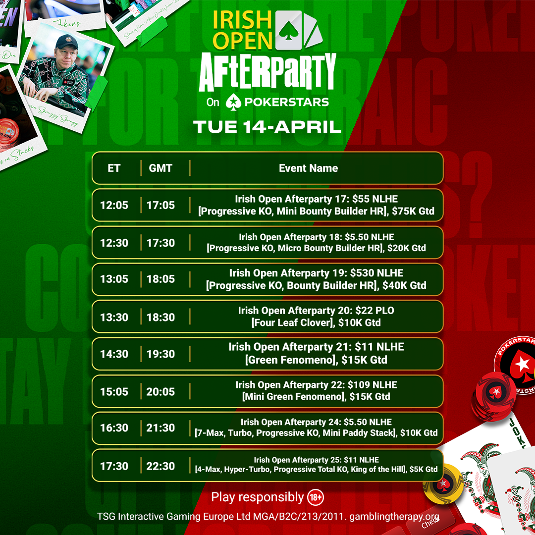 | Apr 20 | Mon | 15:05 | 20:05 | Irish Open Afterparty 68: $55 NLHE [7-Max, Hyper-Turbo, The Slán] | $55 | $35K |