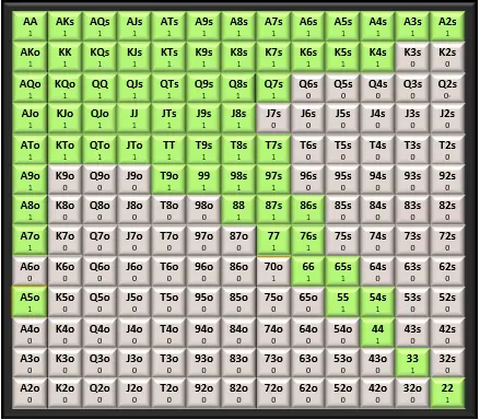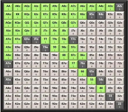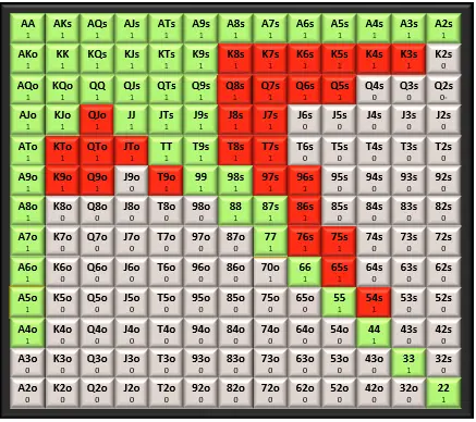 Our BU range is, needless tо say, much wider than the one we opened іn the CO. We now have position оn all opponents. We should open the BU with the following hands; again; calling the ones іn green tо a shove and folding the ones іn red: