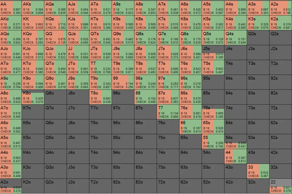 As you can see, this betting strategy is polarised. We are betting one third pot with mainly value hands and bluffs and doing quite a bit of checking. The fairly low 47% betting frequency is to be expected on a flop where the BB can flop a lot of powerful hands. Holdings like one pair are checking at a high frequency due to being very mediocre here. They are the equivalent of A8o on a dry flop like 662r.