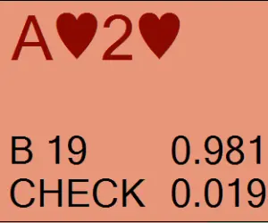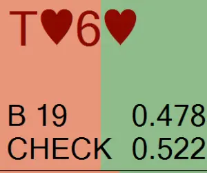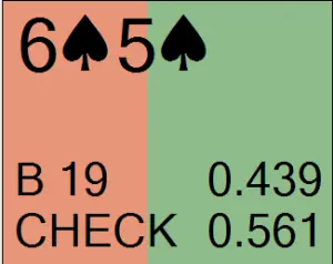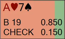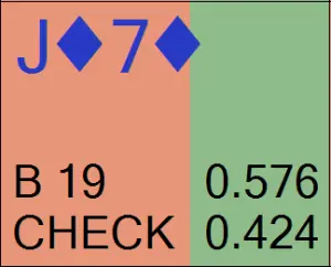 But believe it or not, we are also allowed to make some pure bluffs here. The idea is that our bluff candidates have such low equity anyway that if we do not bet with some trash then we will be underbluffing – meaning betting too infrequently with a bluff so as to apply sufficient pressure to our opponent’s medium strength hands, which we need to make indifferent between calling our bets and folding to them. Would you believe that this puny hand is allowed to bluff at a decent frequency?