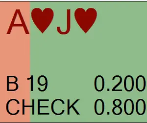 Okay, so our sizing is going to be no more than 33% pot here, but which hands should we bet? Here is the recommended range. Note that the big bet option isn’t taken into consideration this time due to how infrequently we would use it. Once again, pink is bet 33% pot and green is check, and the flop is K♥Q♥9♥.
